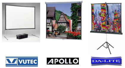 La gama de telones de proyección que provee nuestra empresa, se destacan por sus características y tamaños, partiendo desde 1.52x1.52 hasta 4x3 metros. De estos, se encuentran con trípodes, murales, eléctricos y tipo mecano, para grandes presentaciones. Las marcas que representamos son Da-Lite, Vutec y